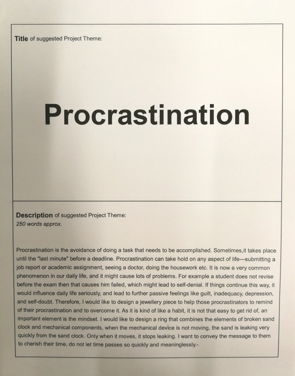 I researched deeply and detailedly the definition of procrastination today, about what it means, the expression of procrastination, the influence and the result it causes by procrastination etc. In order to design a jewellery that could help people to overcome their weaknesses- procrastination, I think it is important for me to have a better understanding of it. During the research, I found out some interesting information about procrastination, such as the positive status of procrastination, which this kind of people like working under pressure so that they could make a more considered decision. I think I am this kind of person, for me, I feel procrastination is a kind of way of saving time, as I am confident that I could finish my tasks last minute, it is more efficient than in normal times. In that, I could do more relaxing activities before the deadline. However, I think that kind of thinking is not right because the pressure when I am trying to finish my task last minute makes me anxious, and it also influences the physical health because I might stay up quite late. If things continue this way, it is not good for physical and mental health neither. Overall, procrastination is a bad habit, I think we are supposed to correct this shortcoming.