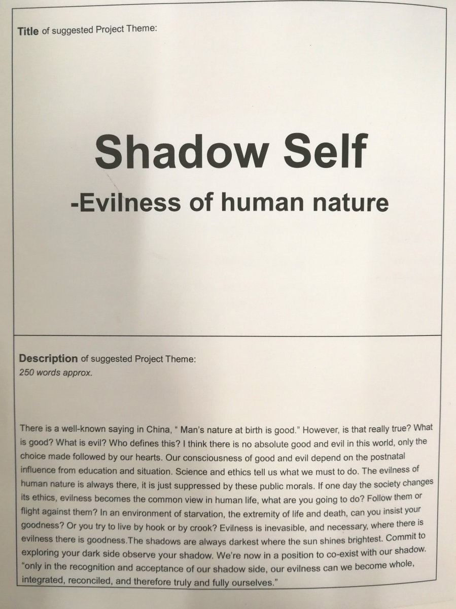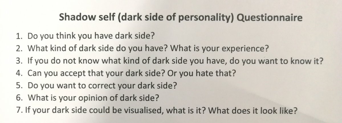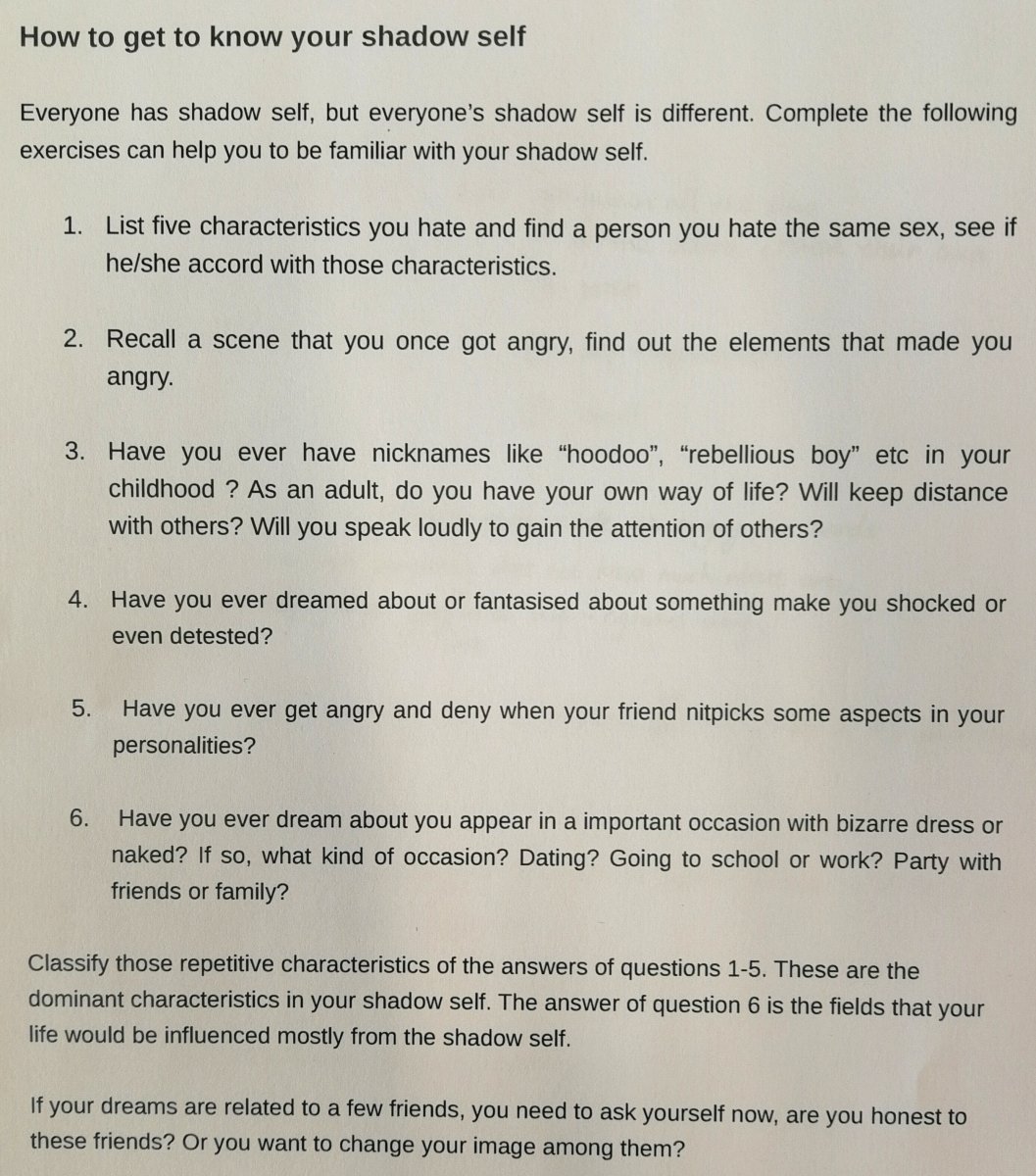 I made a questionnaire today, however, I realise it is quite personal, therefore I did not have much expectation that I could get much feedback. Indeed, I did not receive any feedback from them, because they said they never thought about that before, and they do not really know what kind of their shadow self is. Most of them admit they have a dark side, and they think everyone has it, but it is hard to describe it, and they feel shame to talk about it. I think the way I ask those questions is too direct, however, I do not know how to ask those questions euphemistically to get direct answers.