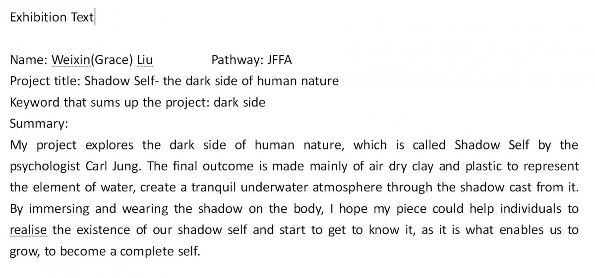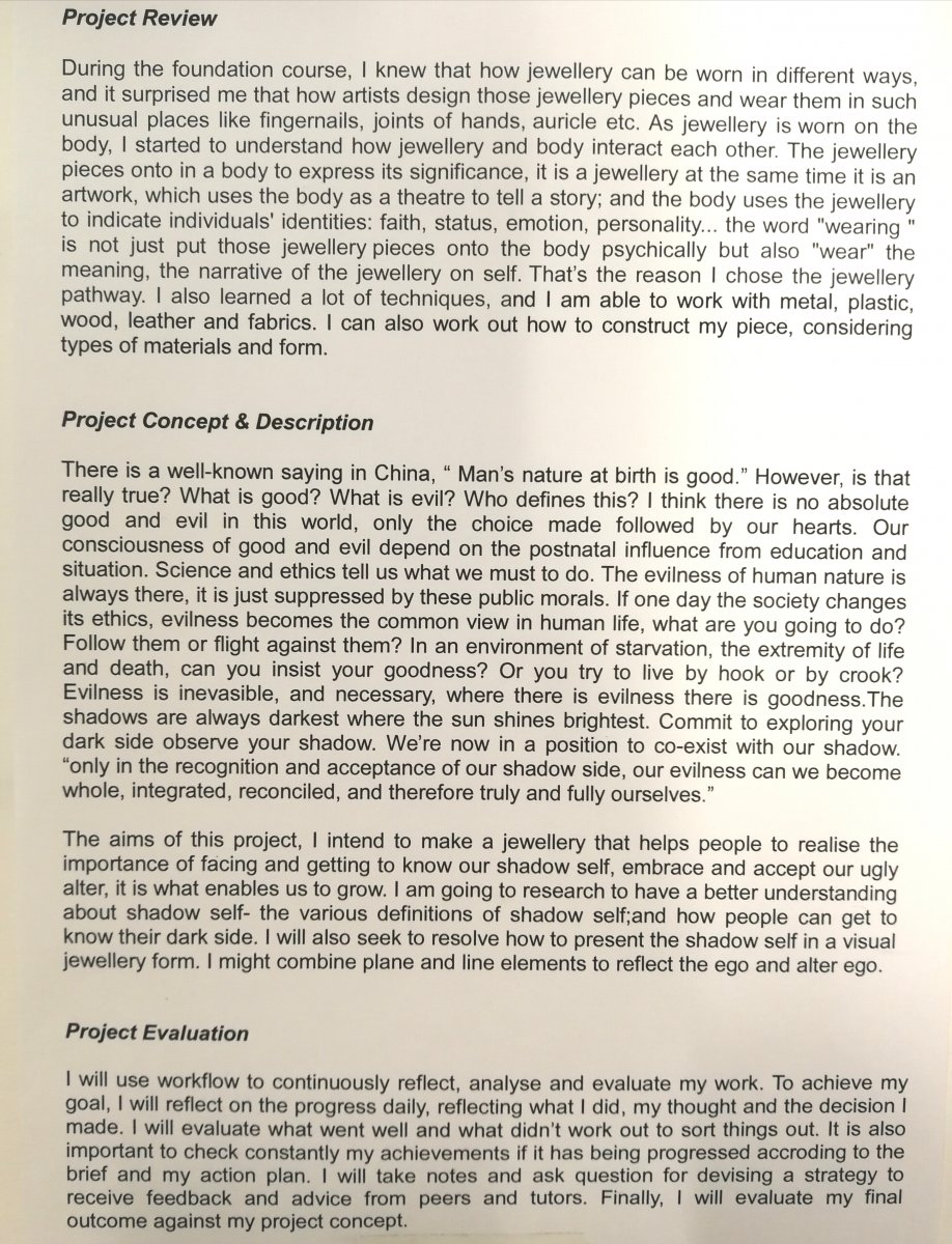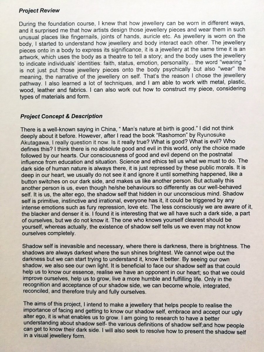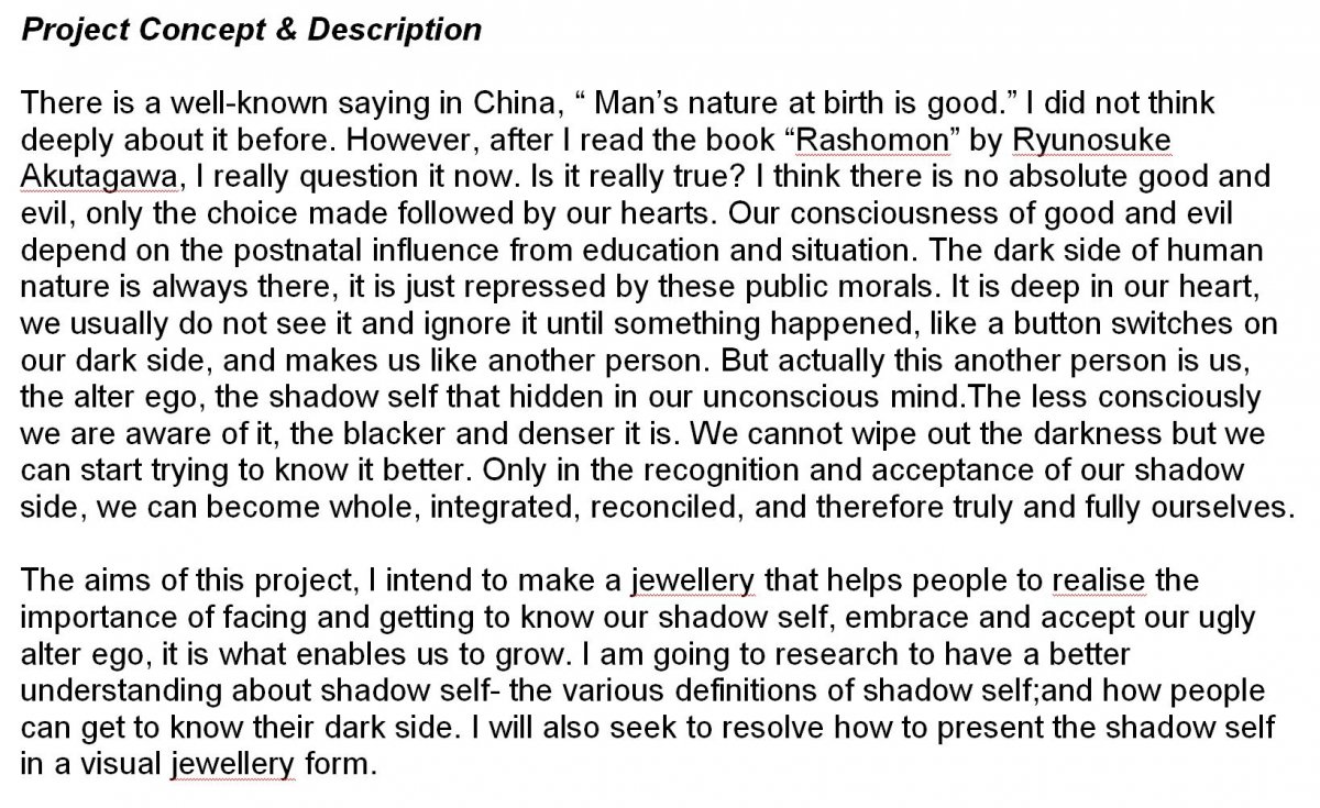 The theme of my project is "Shadow Self", at the beginning of research, I tried to find out detailed definitions of "Shadow Self", as it is a psychological term phrase. By reaching it further, I understand more about it, and I knew what message I want to convey through this project. "Shadow Self" is the dark side of our natures, we even do not want to acknowledge it; Even though it is largely negative and dark, it is beneficial to face it to understand ourselves more, so that enables us to grow, to be a complete self. I hope the audiences could start to realise their shadow self by my jewellery piece, this is what my aim is.