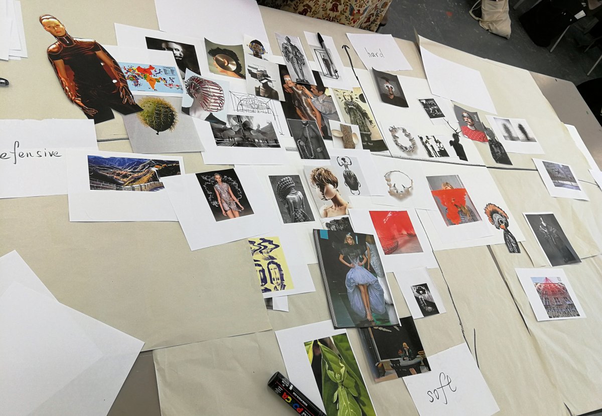 Today we gathered our research images together for sharing and inspiration. We did a few exercises to classified those images into the different group in order to get a wider research range and share the ideas. At first, we classified those images by the similarities of theme, materials and colour etc, so we got groups like body movement, metal, protection, loneliness, spike, natural and colourful. By looking at those images, I did find some of them matches my theme, I might go to research more about them later. The next exercise, we drew a horizontal line across the paper, chose two words written in the end, such as tender and extreme, natural and artificial; then we put those images by considering which way they tend to. This method of reorganising the images helps me to think about the area I towards. I found this exercise is quite useful, it makes me deeply consider the direction I want my piece to be. Is it tend to tender or extreme? Will my work go hard or soft; defensive or aggressive; natural or artificial? Do I want my audience to have a strong sense of the darkness of shadow self, to accept it or I just want to encourage them to realise the existence of shadow self? This exercise enhances my depth of thinking, I think I would do this kind of exercise for my next project as well.