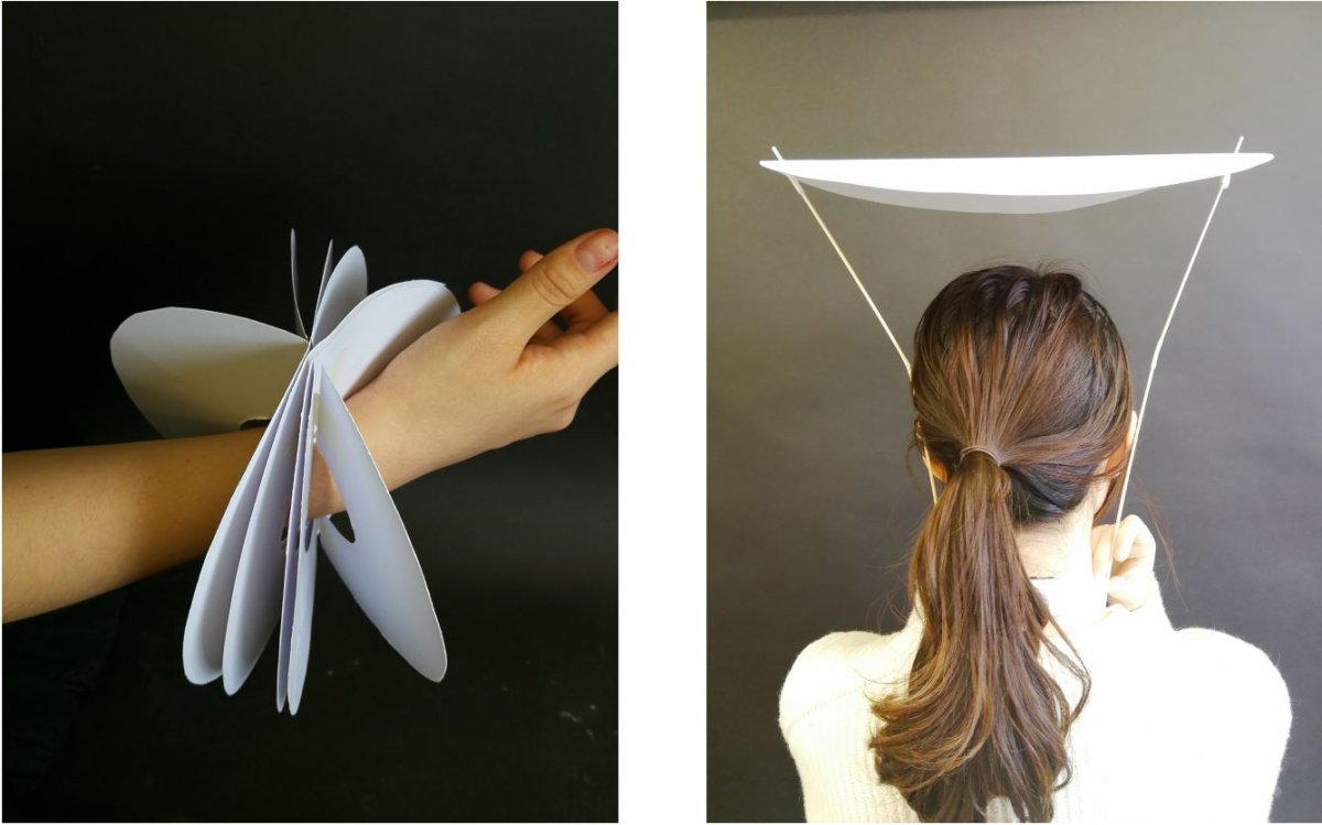 I made four models based on my design drawings from different parts of the body today: foot, wrist, head and fingers. I quite like the one on the wrist, it consists of several circular rings. When they are all overlap together, it looks like only have one plane, but when they are spread, several layers revealed. It shows my concept of shadow self, the overlap element represents the persona as we usually show to others one side of our personality, however, our personality is complicated, there are much people cannot see behind the surface. Those other circular rings suggest the shadow self, the hidden aspects of our personality. I also like the piece that connects from the neck and above the head, although there is a mistake when I first made it from my best design drawing, the position of the holes for the sticks connected to it is wrong, either enlarge the size of the neck piece or narrow the distance between the two holes on the circular plane; I still like it, the height of it is appropriate and comfortable, and I like the simplicity of the design. Another problem with this model is the bearing capacity of it, as the model is made of paper and thin sticks, the size of the circular plane is too big and the stick is too thin to support it, if I make it into a formal jewellery piece, I would use acrylic tubes instead of the stick, and I would consider the weight of the material of the circular plane. I do not really like the neck piece part, even though I enlarge its sie, it would be not stable in the position when the model wears it, so I would change its design to make it more appropriate.