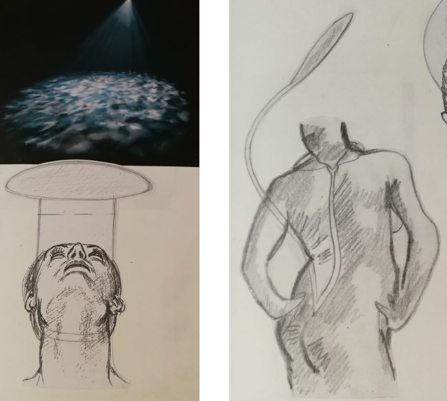 Among all these initial designs drawings on the body, I like the one which a plane circle piece above the head and connected with two rods to the neck best. It is inspired by an image of the underwater world when a light shining in and creates the dramatic shadow on the bottom of the sea. I like the simplicity of the design, the form is very concise but effective, as the main focus will be the circle piece when the light comes in and creates a shadow on the face. Initially, I was thinking to use a plain aluminium mash piece, but after I think it would be better to make the circle piece kind of curved to contain water so that create a flowing shadow. I also like the design of a curved tube on the back connects to a piece of a circular plane, the design is concise with a beautiful curvy shape. I think I might put black liquid inside the tube to suggest the developing shadow self; however, the overall form looks kind of like a lamp, therefore I might enhance this design later.