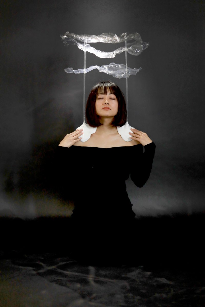 However, during the making process of models, I met a serious problem is the weight of the upper plastic piece when it contains the water, it is too heavy to be supported by the shoulder part; besides, the height makes it much harder. By talking to my tutor, they suggested me to redesign without the water as the ripple pattern on the plastic pieces already represents the element of water. Therefore I changed my final design and made it three layers of plastic pieces to suggest the different levels and sides of shadow self.